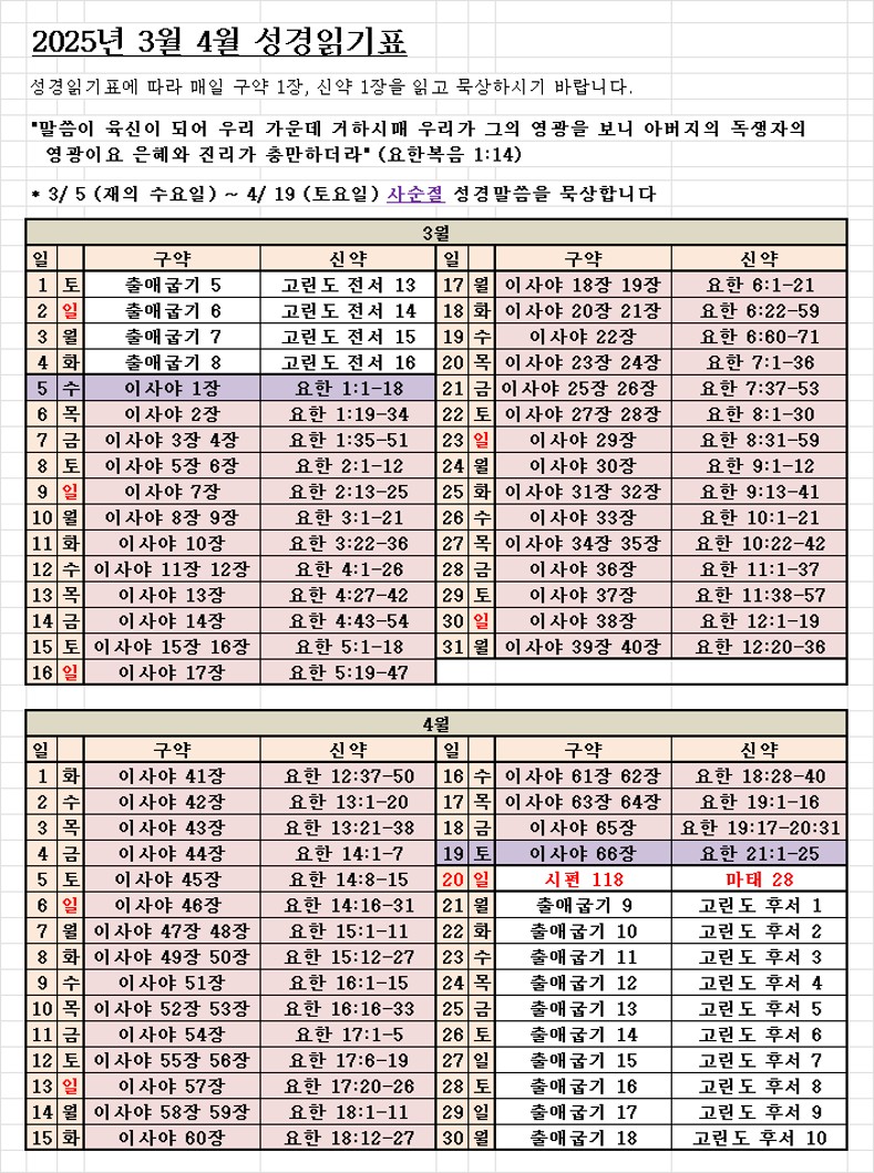 2025년 3월 4월 성경읽기표 (사순절 성경읽기 포함)