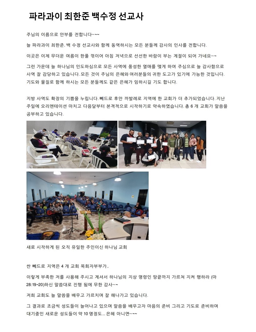 파라과이 최한준 선교사 선교소식들 1 > 선교소식