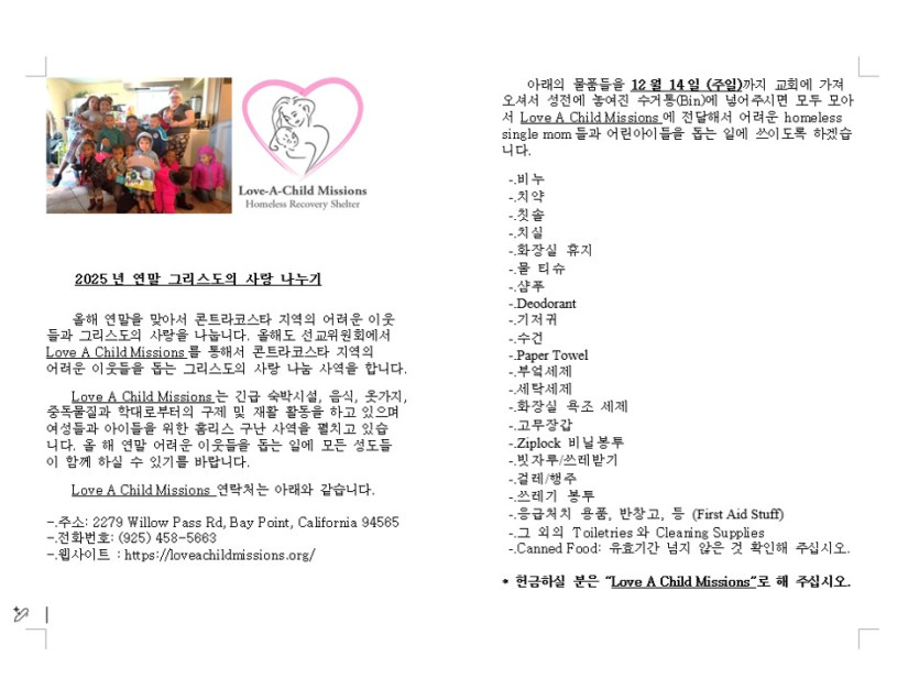 헌금은 “Love A Child Missions”으로 해 주십시오.