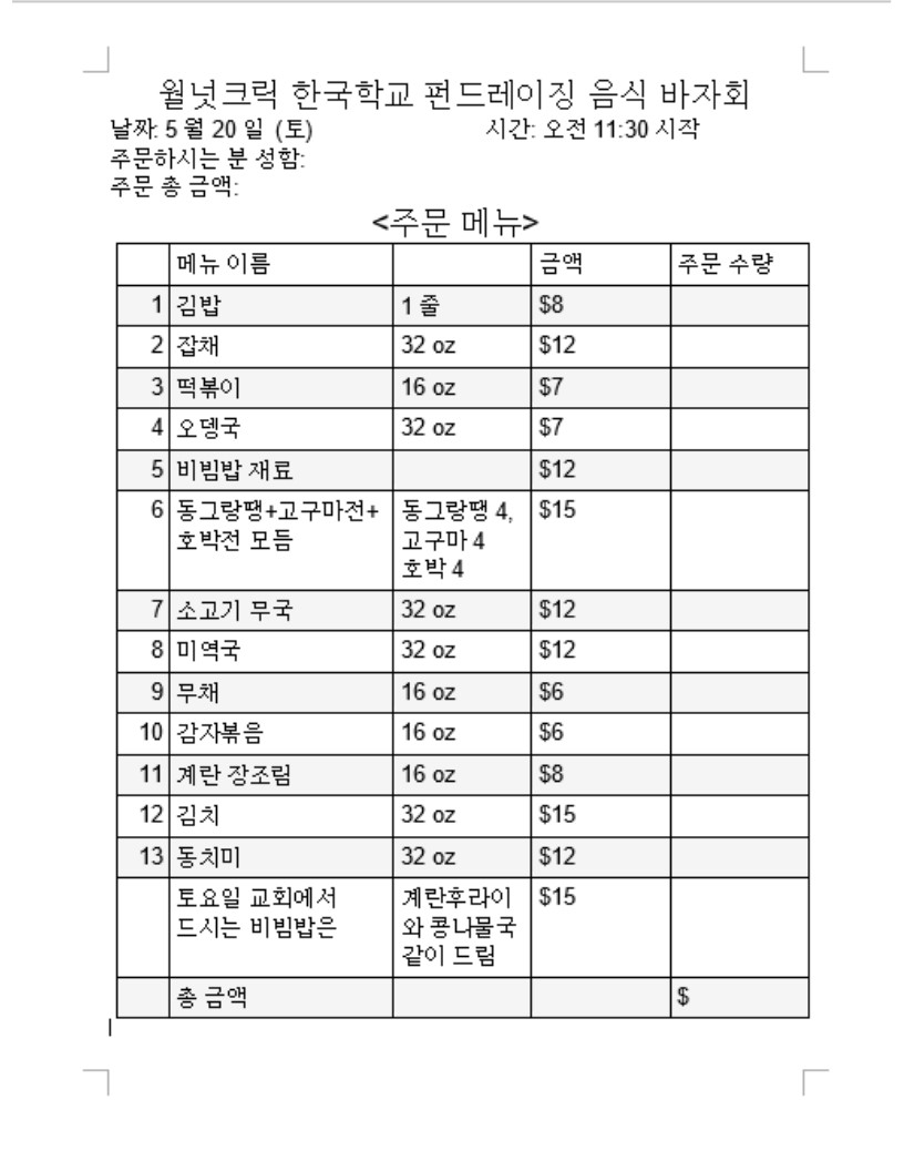 월넛크릭 한국학교 펀드레이징 음식바자회 (5/20) > 교회소식