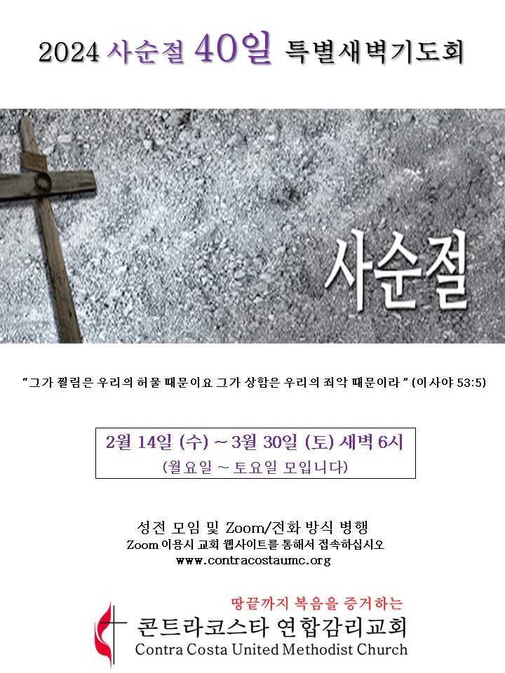 사순절 40일 특별새벽기도회 2/14(수)~3/30(토) 월~토요일 새벽기도회로 모입니다.