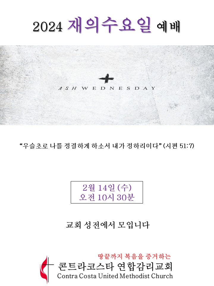 재의 수요일 예배 2/14 (수) 오전 10시 30분, 교회 성전