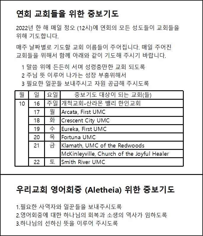 연회 교회 및 우리교회 영어회중을 위한 주간 중보기도 (10/16-10/22)