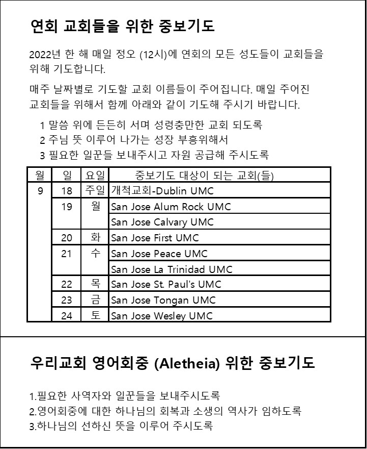 연회 교회 및 우리교회 영어회중을 위한 주간 중보기도 (9/18-9/24)