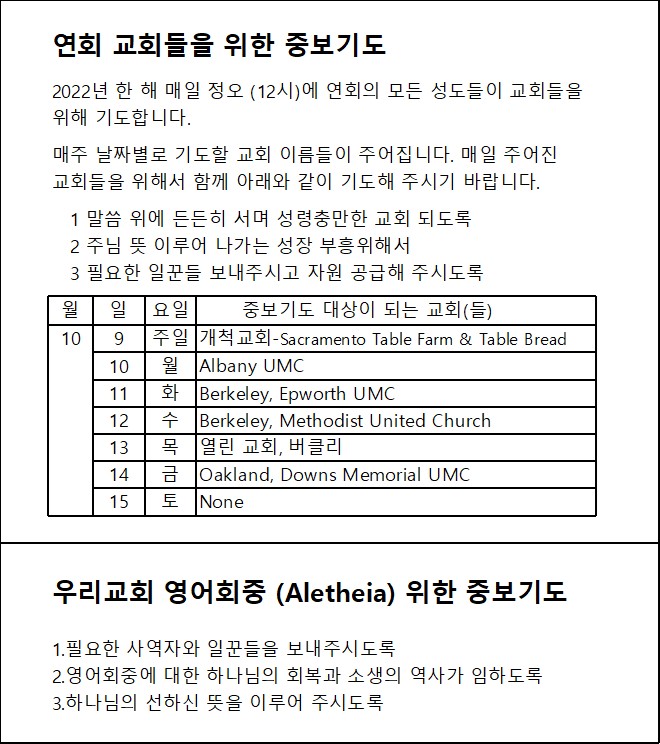 연회 교회 및 우리교회 영어회중을 위한 주간 중보기도 (10/9-10/15) > 교회소식