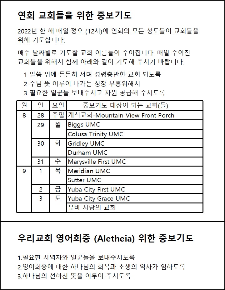 연회 교회 및 우리교회 영어회중을 위한 주간 중보기도 (8/28-9/3)