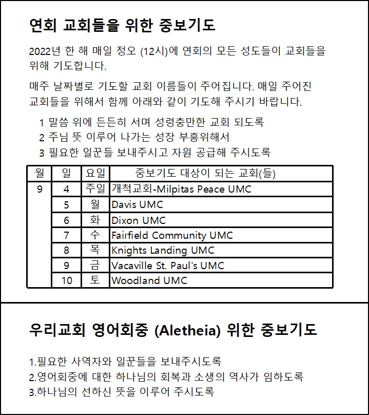 연회 교회 및 우리교회 영어회중을 위한 주간 중보기도 (9/4-9/10) > 교회소식