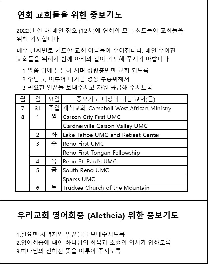 연회 교회 및 우리교회 영어회중을 위한 주간 중보기도 (7/31-8/6)