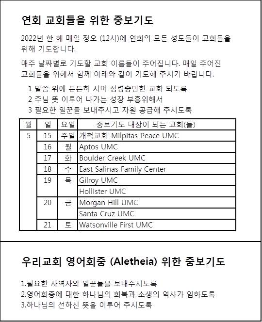 연회 교회 및 우리교회 영어회중을 위한 주간 중보기도 (5/15-5/21)