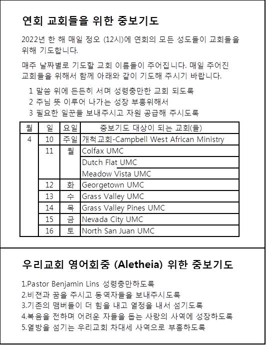 연회 교회 및 우리교회 영어회중을 위한 주간 중보기도 (4/10-4/16)