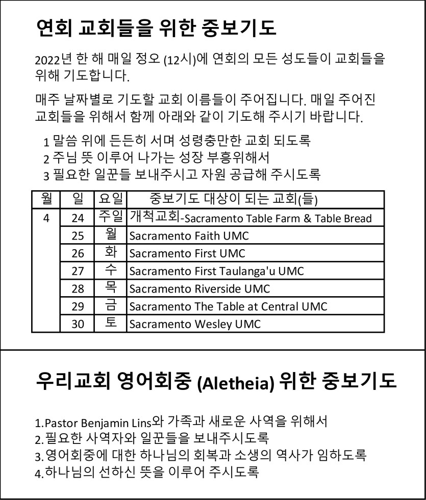 연회 교회 및 우리교회 영어회중을 위한 주간 중보기도 (4/24-4/30)