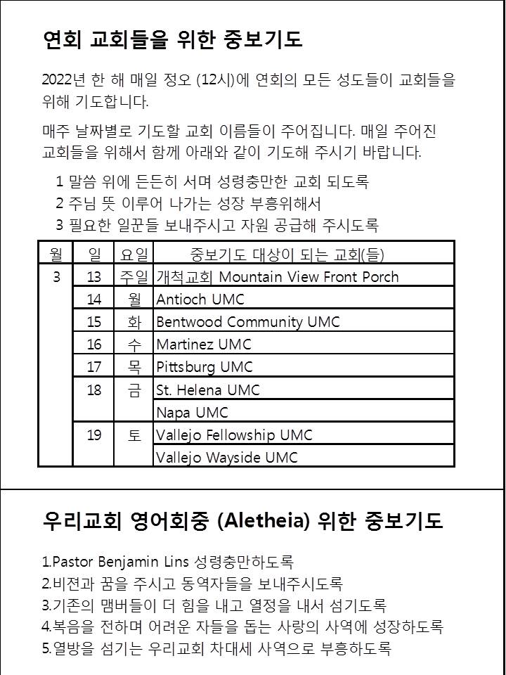 연회 교회 및 우리교회 영어회중을 위한 주간 중보기도 (3/13-3/19)