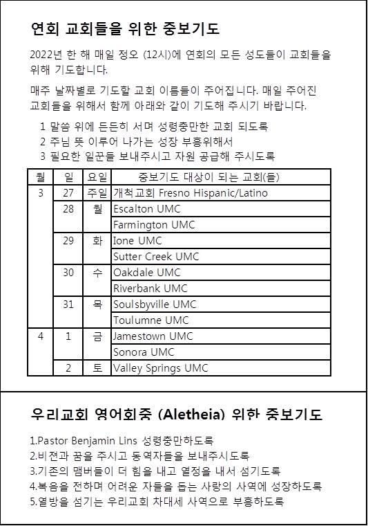연회 교회 및 우리교회 영어회중을 위한 주간 중보기도 (3/27-4/2)