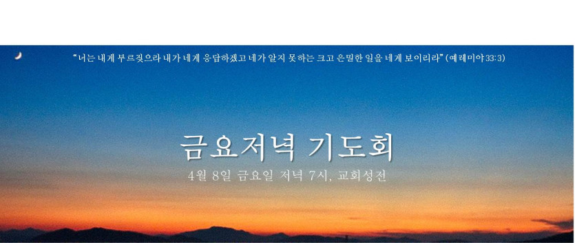 금요저녁 기도회 4월 8일 금요일 저녁 7시, 교회 성전