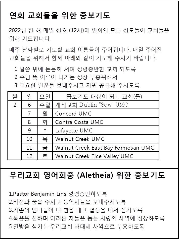 연회 교회 및 우리교회 영어회중을 위한 주간 중보기도 (2/6-2/12)