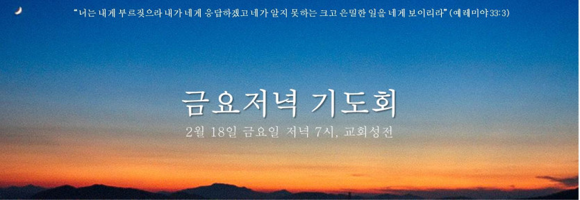 금요저녁 기도회 2월 18일 금요일 저녁 7시, 교회 성전