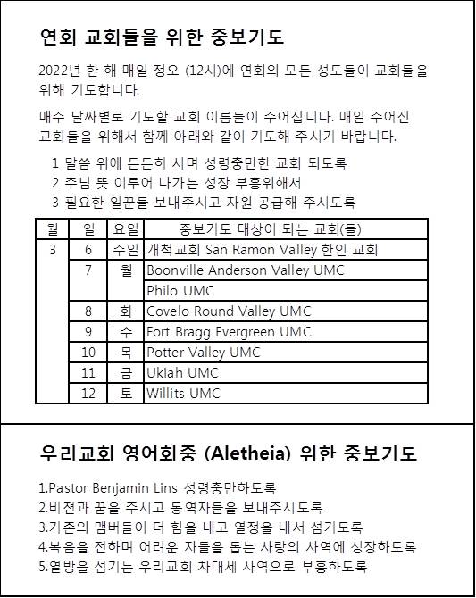 연회 교회 및 우리교회 영어회중을 위한 주간 중보기도 (3/6-3/12)