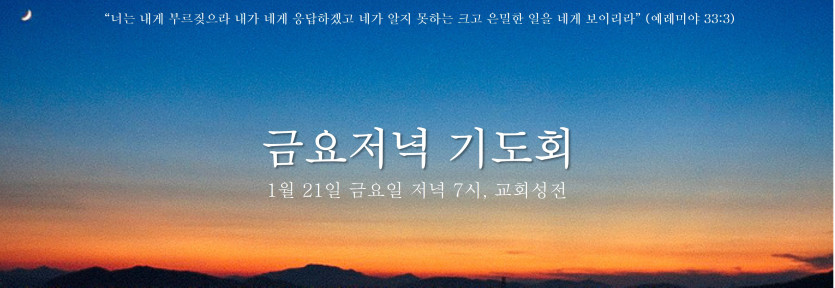 금요저녁 기도회 1월 21일 금요일 저녁 7시, 교회 성전