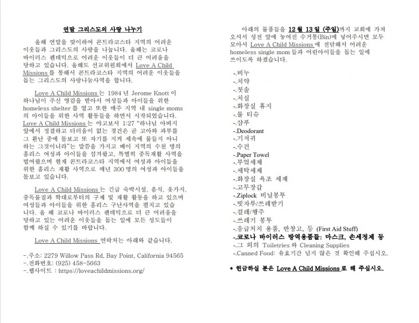 아래의 물품들을 12월 13일 (주일)까지 가져오셔서 성전 문 앞에 비치된 통에 넣어주십시오.