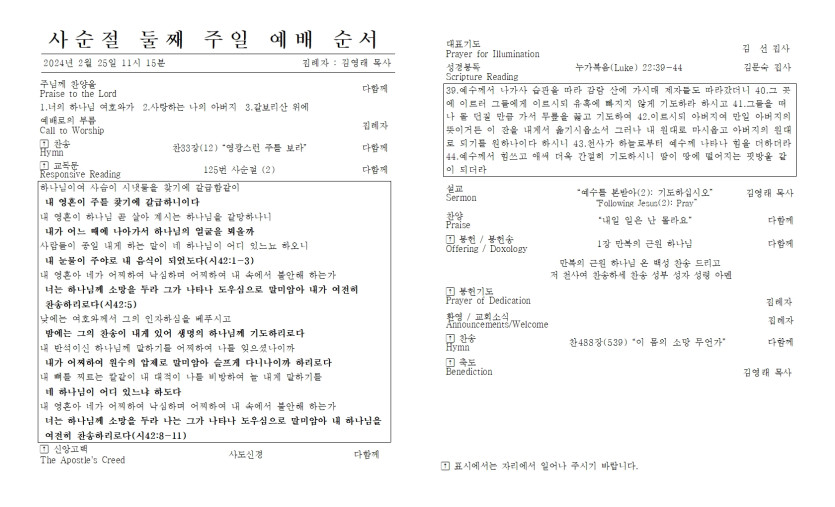 2024년 2월 25일 사순절 둘째 주일 예배 주보 > 주보