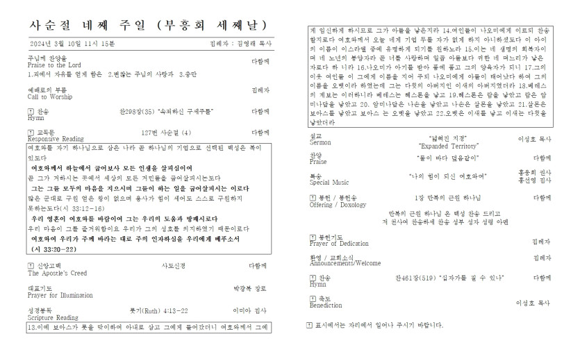 2024년 3월 10일 사순절 네째 주일 (부흥회 세째날) 예배 주보