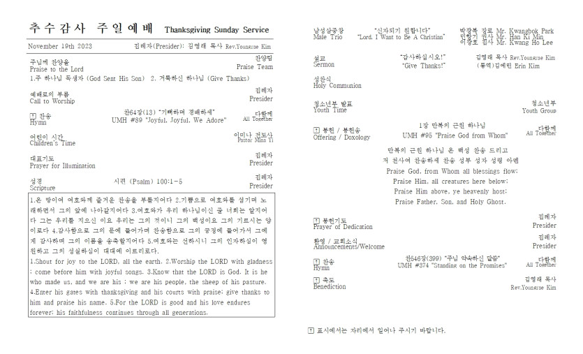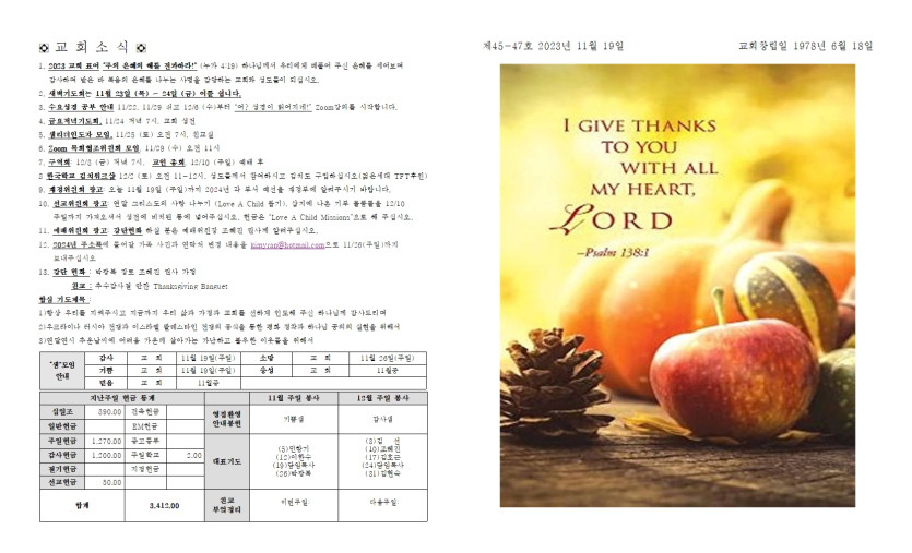 11월 19일 추수감사 주일 예배 주보