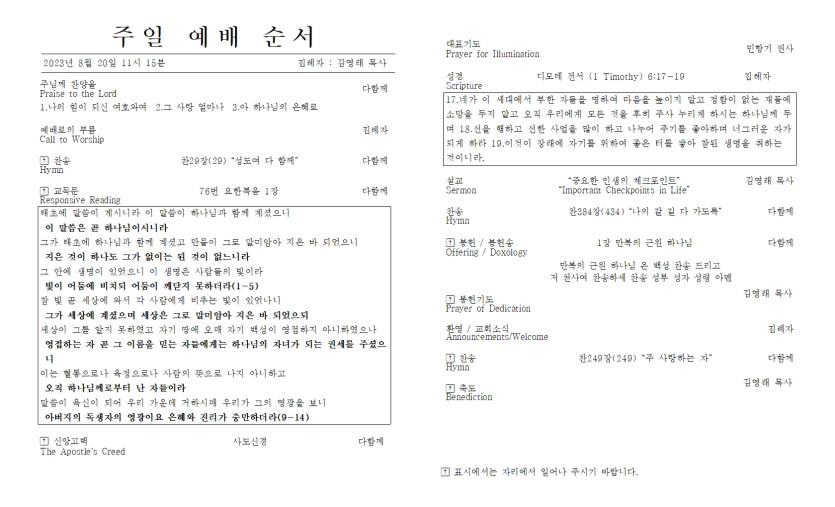 8월 20일 주일 예배 주보 > 주보
