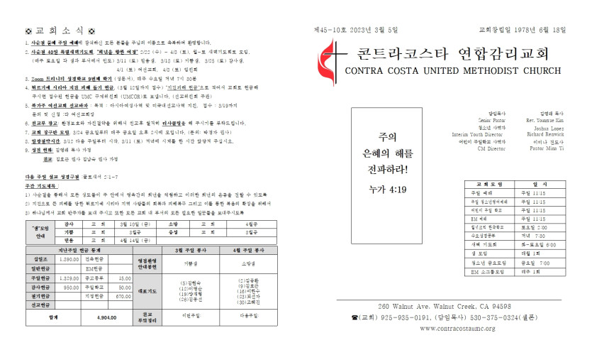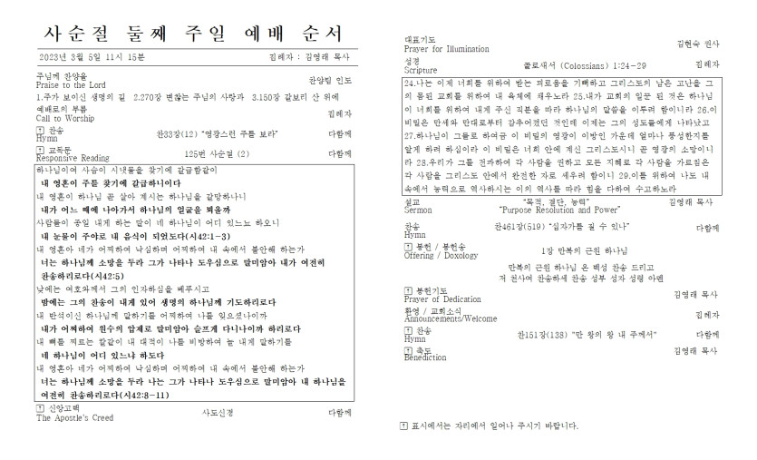 - 이전글2023년 3월 12일 사순절 세째 주일 예배 주보 23.03.11