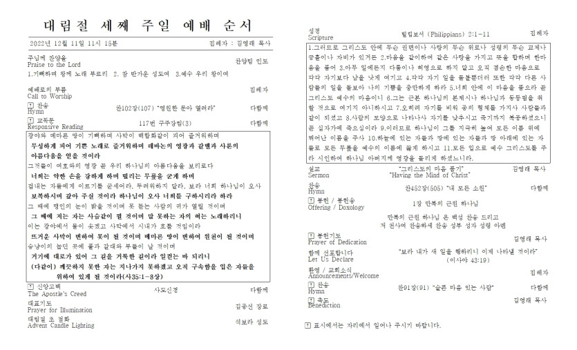 2022년 12월 11일 대림절 세째 주일예배 주보 > 주보
