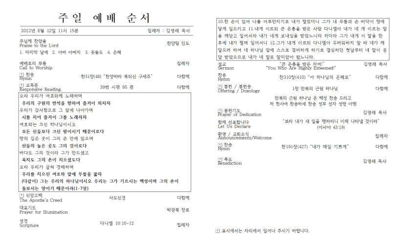 - 이전글2022년 6월 19일 창립 44주년 감사 주일 예배 및 임직식 주보 22.06.18