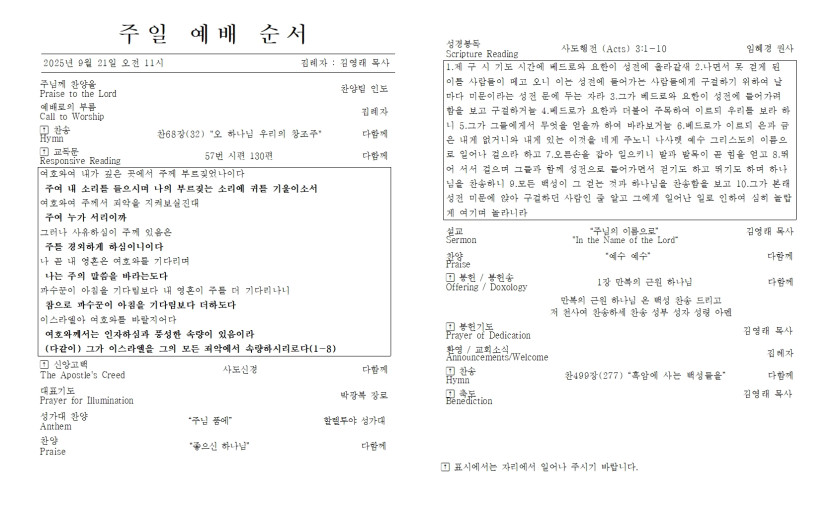 2025년 9월 21일 주일 예배 주보 > 주보