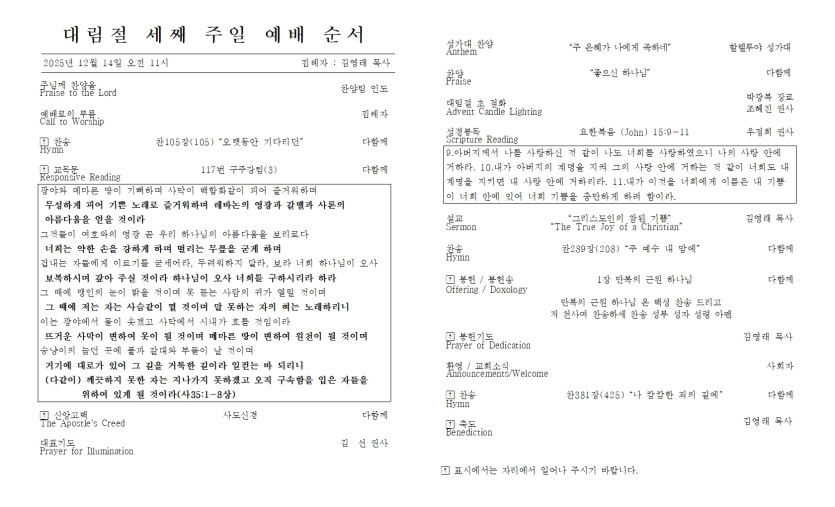 2025년 12월 14일 대림절 세째 주일 예배 주보