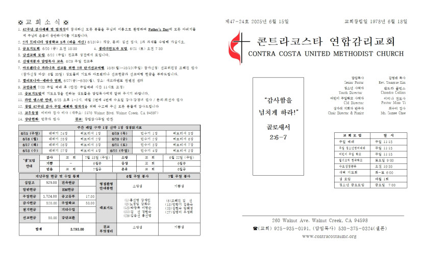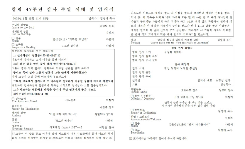 2025년 6월 15일 창립 47주년 감사 주일 예배 및 임직식 주보 > 주보