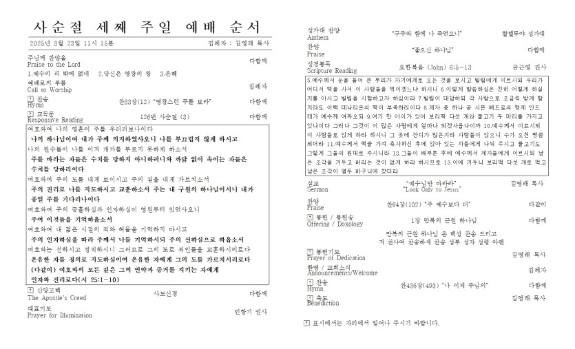 2025년 3월 23일 사순절 세째 주일 예배 주보 > 주보