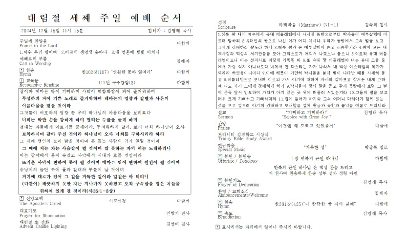 2024년 12월 15일 대림절 세째 주일 예배 주보 > 주보