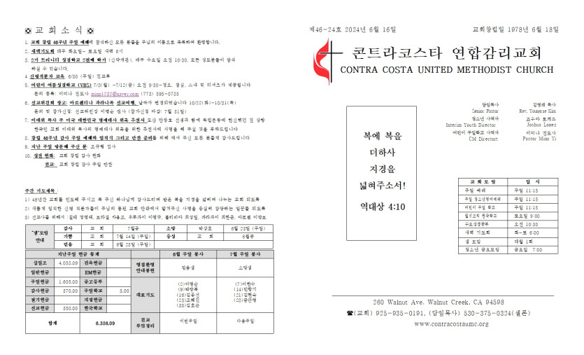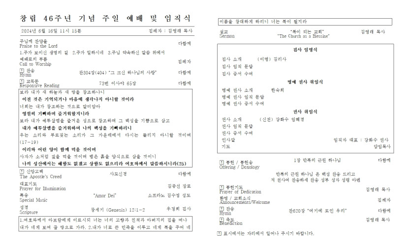 2024년 6월 16일 교회 창립 46주년 감사 주일 예배 및 임직식 주보 > 주보