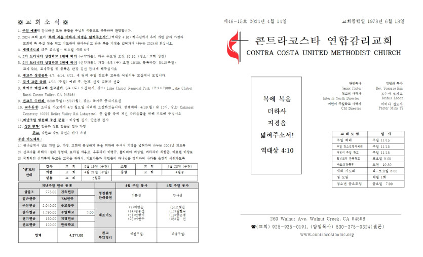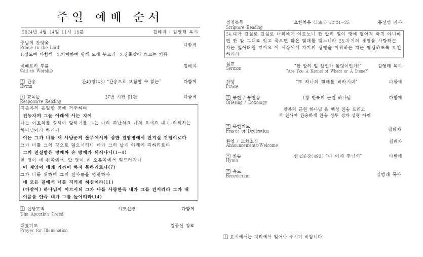 2024년 4월 14일 주일 예배 주보 > 주보